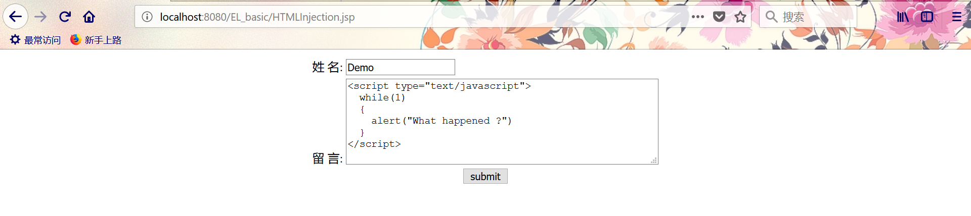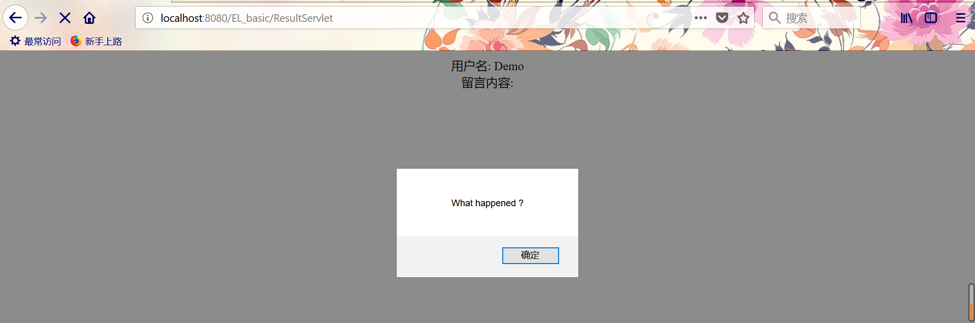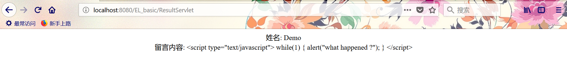 JSP页面的程序代码<%@ page language="java" contentType="text/html; charset=UTF-8" pageEncoding="UTF-8"%> <%-- uri: 既tld文件中<uri>元素的内容. prefix: 为引用的tld文件定义一个"代号"(作为自定义EL函数的前缀) --%> <%@taglib prefix="demo" uri="https://yubuntu0109.github.io" %> <!DOCTYPE html> <html> <head> <meta charset="UTF-8"> <title>防止`HTML`注入</title> </head> <body> <div align="center"> 姓名: ${name }<br> 留言内容: ${demo:filter(message) } </div> </body> </html>运行效果示例图