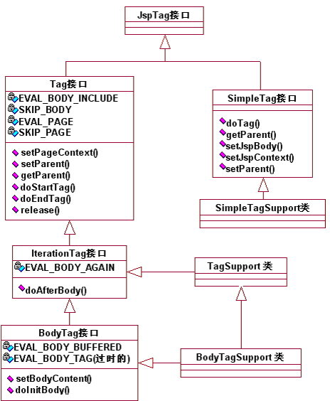 Tag接口和SimpleTag接口定义了JSP页面与标签处理器类之间的通信规则.如果JSP引擎在编译JSP页面时遇到了自定义标签,传统标签将会调用标签处理器的doStartTag()方法,简单标签将会调用标签处理器类的doTag()方法.