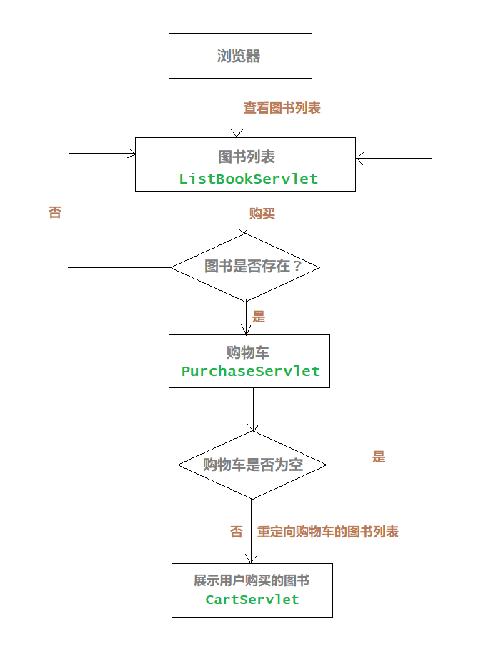 案例描述 : 购物车的的实现流程如下图所示,当用户使用浏览器访问某个网站的图书列表页面时,如果购买某一本书,那么首先会判断书籍是否存在,如果存在就加入购物车,跳转到购物车中所购买图书的列表页,否则,返回图书列表页面.