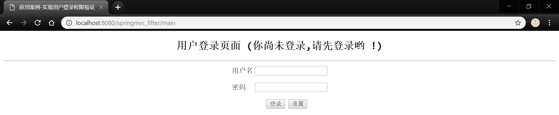 7. 将项目发布到Tomcat服务器并启动,在浏览器中访问地址: http://localhost:8080/springmvc_filter/main 其页面如下: