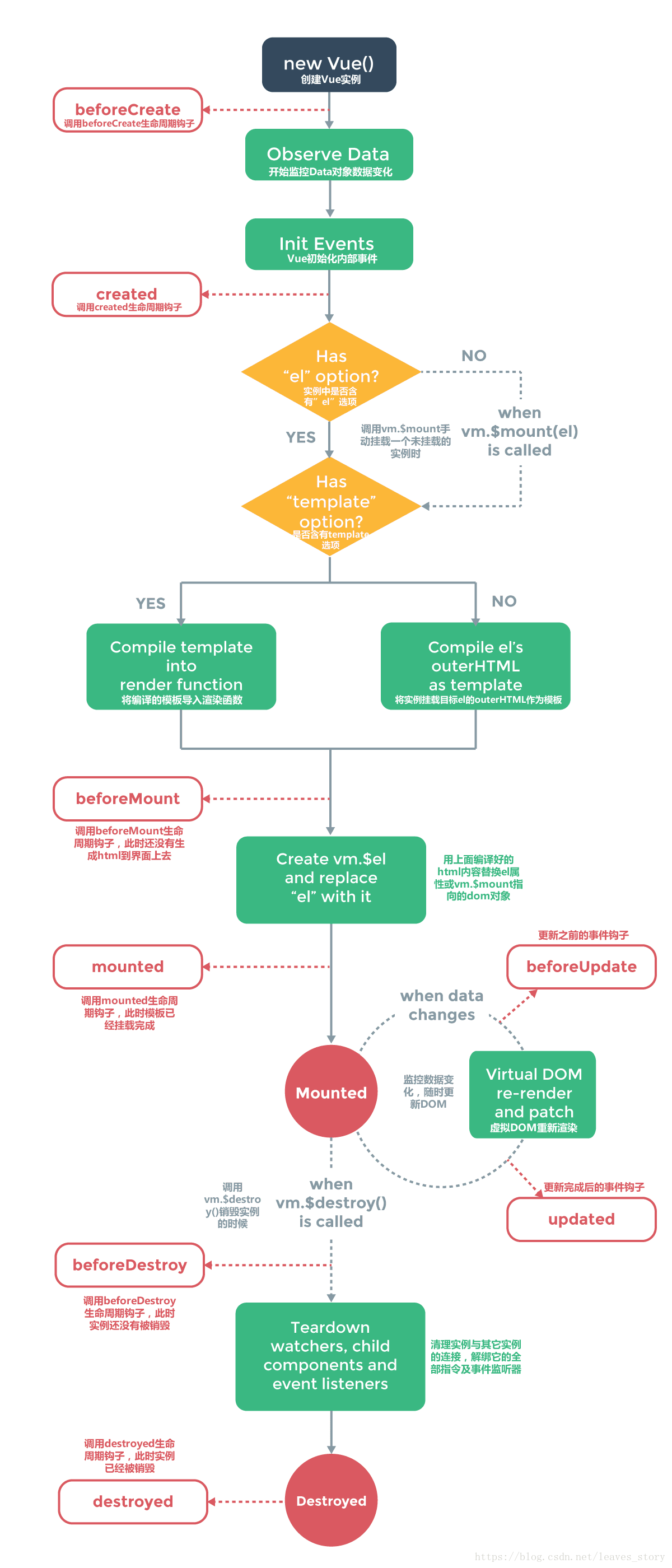 从Vue实例创建,运行,到销毁期间,总是伴随着各种各样的事件,这些事件统称为生命周期,至于生命周期钩子只不过是生命周期事件的别名而已. 其生命周期图如下所示 :