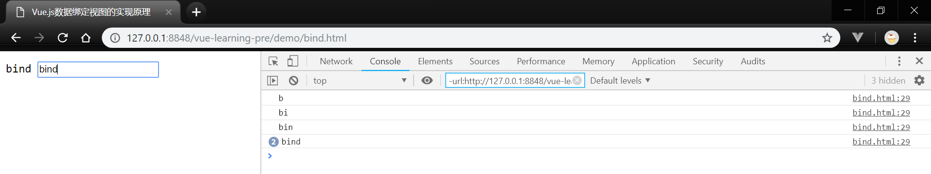 下面通过一个示例程序,事实现数据与视图之间的双向绑定 : 在对象函数的setter函数中修改文本节点的值,所以当obj.profile被重新赋值时,节点视图也会同步更新; 然后对输入框添加事件监听(addEventListener),当用户事件触发时,输入值将被赋予obj.profile. 以此方式,我们实现了数据与视图之间的双向绑定,这也就是Vue数据与视图绑定的实现原理 .