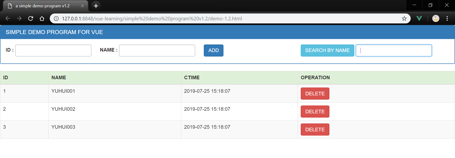 | <!DOCTYPE html> <html> <head> <meta charset="utf-8"> <script src="../vue.js"></script> <link rel="stylesheet" href="../simple%20demo%20program%20v1.0/resources/bootstrap.css" /> <title>a simple demo program v1.2</title> </head> <body> <div id="app"> <div class="panel panel-primary"> <div class="panel-heading"> <h3 class="panel-title">SIMPLE DEMO PROGRAM FOR VUE</h3> </div> <div class="panel-body form-inline"> <label> ID : <input type="text" class="form-control" v-model="id" /> </label> <label style="padding-left: 20px;"> NAME : <input type="text" class="form-control" v-model="name" @keyup.enter="add()" /> </label> <label> <button class="btn btn-primary" style="margin-left:20px ;" @click="add()">ADD</button> </label> <label style="padding-left: 213px;"> <button class="btn btn-info">SEARCH BY NAME</button> <input type="text" class="form-control" v-model="keyword" v-focus v-color="'blueviolet'" /> </label> </div> </div> <table class="table table-bordered table-hover table-striped"> <thead> <tr class="success"> <th>ID</th> <th>NAME</th> <th style="width: 328px;">CTIME</th> <th>OPERATION</th> </tr> </thead> <tbody> <tr v-for="user in search(keyword)" v-bind:key="user.id"> <td>{{user.id}}</td> <td>{{user.name}}</td> <td>{{user.ctime | dateStrFilter('')}}</td> <td><button class="btn btn-danger" @click="del(user.id)">DELETE</buttom> </td> </tr> </tbody> </table> </div> <script> Vue.filter('dateStrFilter', function(dateStr, datePattern = "") { var newDateStr = new Date(dateStr) var year = newDateStr.getFullYear() var month = (newDateStr.getMonth() + 1).toString().padStart(2, '0') var date = newDateStr.getDate().toString().padStart(2, '0') var hour = newDateStr.getHours().toString().padStart(2, '0') var m = newDateStr.getMinutes().toString().padStart(2, '0') var s = newDateStr.getSeconds().toString().padStart(2, '0')