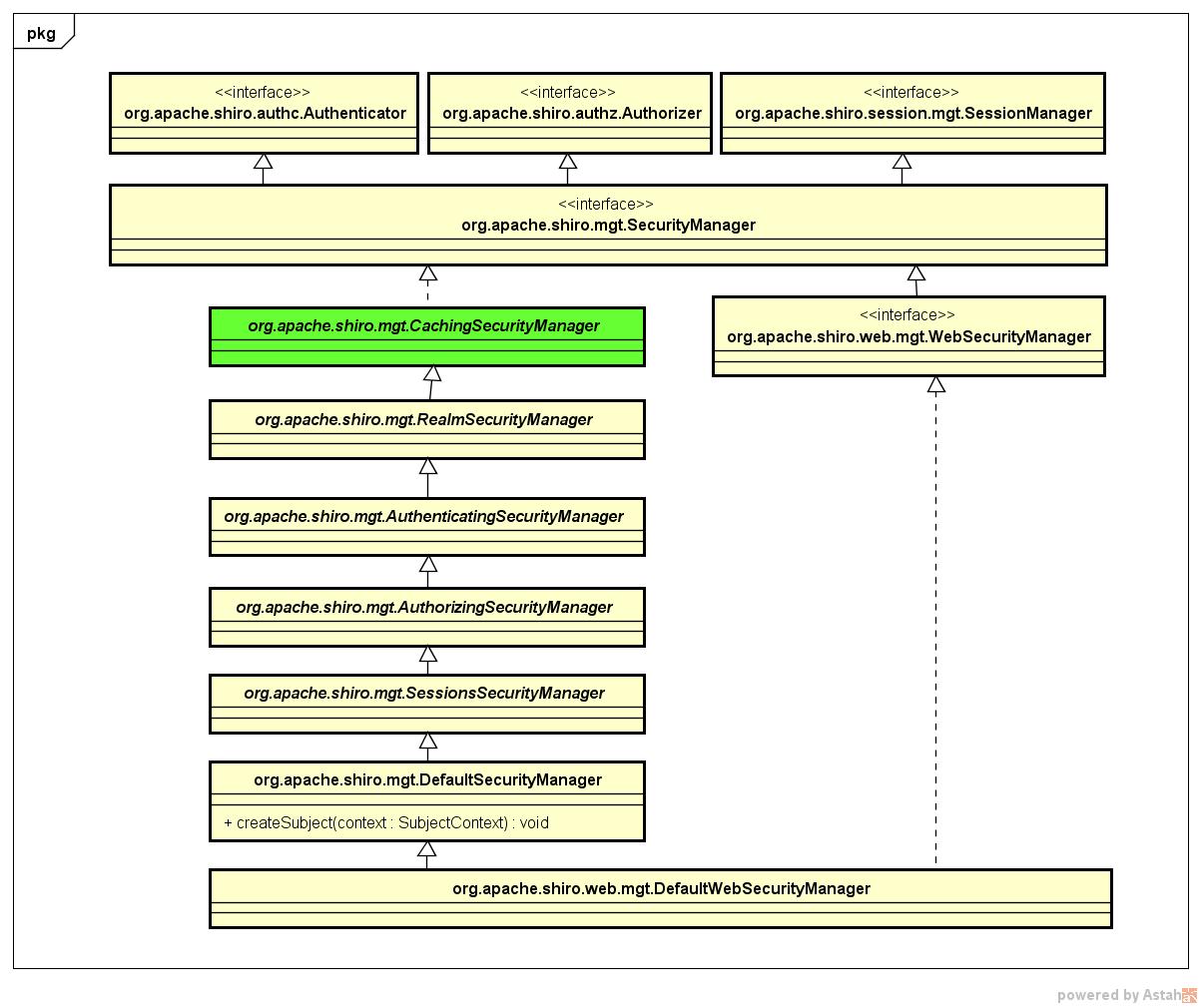 从Shiro缓存组件类图可以看到,Shiro提供的缓存抽象API接口正是 : org.apache.shiro.cache.CacheManager,那么我们应该如何配置和使用CacheManager呢 ? 如下我们以使用Shiro提供的MemoryConstrainedCacheManager组件为例进行说明. 我们知道,SecurityManager是Shiro的核心控制器,我们来看一下其类图 :