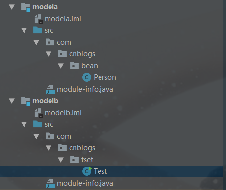 如上示例,如果需要在modelb模块项目中使用modela模块项目的内容,必须在modela项目的module-info.java中定义exports com.cnblogs.bean将该目录下可以被其他模块使用,如果没有写,则包默认是封装在模块下,不被外界使用. 而在modela项目中需要使用requires modela导入需要使用的模块名,则可以在modelb中使用modela定义exports的类 (即而才可以在Test类中使用Person类)