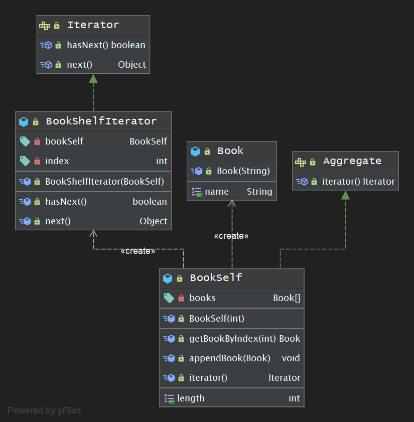 Iterator( 迭代器 ): 该角色负责定义按顺序逐个遍历元素的接口( API ),在上述程序中,由Iterator接口扮演此角色.ConcreteIterator( 具体的迭代器 ): 该角色负责实现Iterator角色所定义的接口( API ). 在上述程序中,由BookShelfIterator类扮演此角色.Aggregate( 集合 / 抽象聚合类 ): 该角色负责定义创建Iterator角色的接口( API ),在上述程序中,由Aggregate接口扮演此角色.ConcreteAggregate( 具体的集合 / 具体聚合类 ): 该角色负责实现Aggregate角色所定义的接口( API ),它会创建出具体的Iterator角色. 在上述程序中,由BookSelf类扮演了此角色.