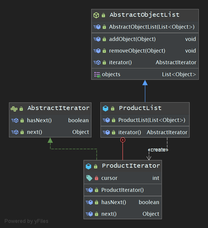 ProductIterator:商品迭代器,充当具体迭代器(使用内部类实现迭代器,与jdk中的迭代器实现原理相同)