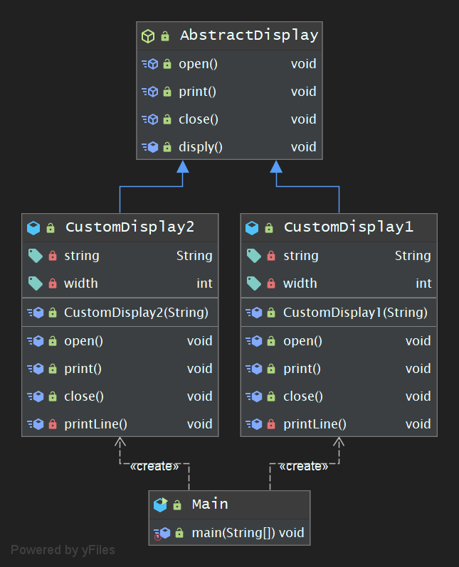 AbstractDisplay abstractDisplay = new CustomDisplay1("Template Method Pattern");