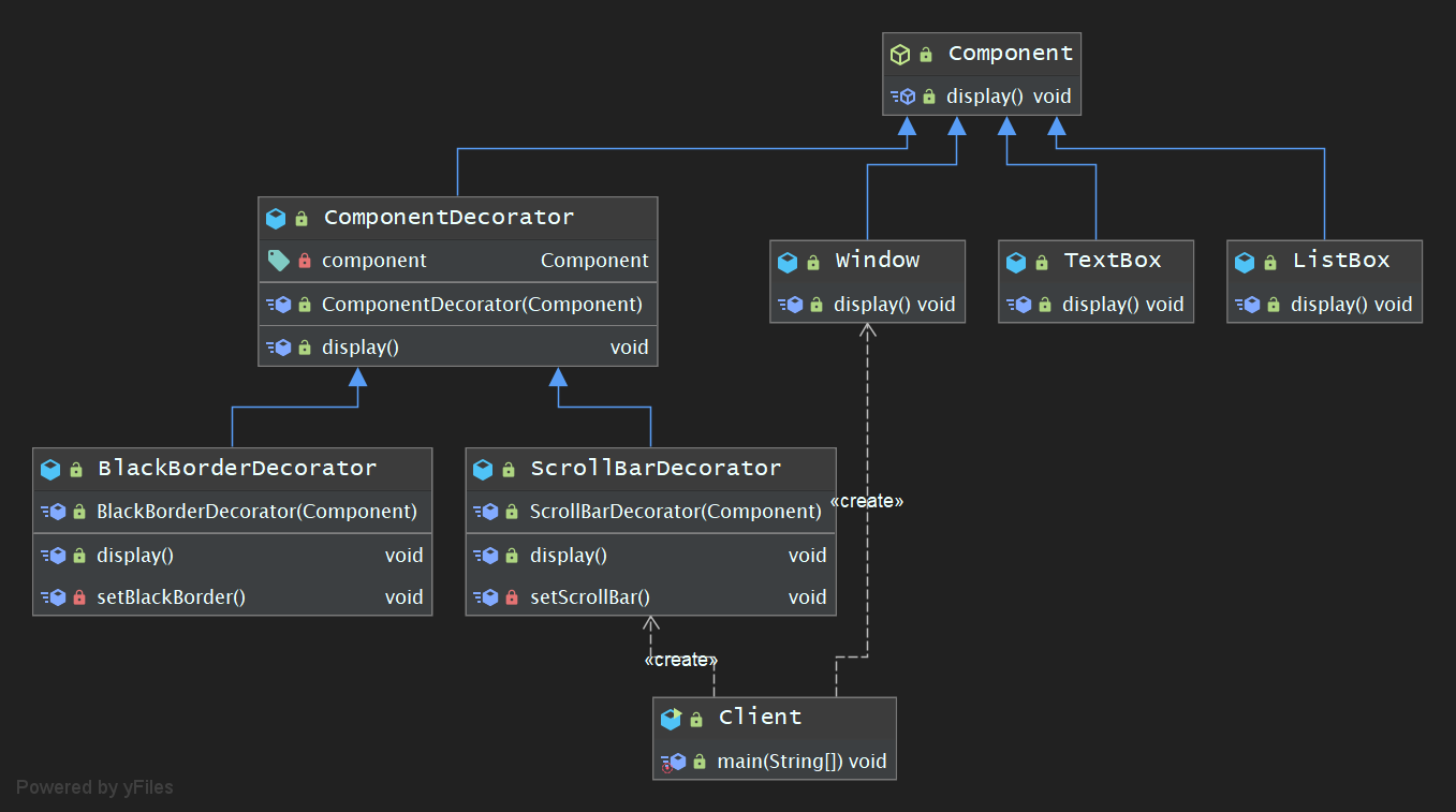 下面是一个使用了装饰设计模式的简单示例程序,其示例说明为 : 使用面向对象技术开发了一套图形界面构件库,该构件库提供了大量的基本结构,如窗体,文本框,列表框等,由于在使用时用户经常要求定制一些特殊的显示效果,如带滚动条的窗体,或带黑色边框的文本框等. 因此经常需要对该构件库进行扩展以增强其功能,既而可以使用装饰设计模式来设计该界面构件库哟~