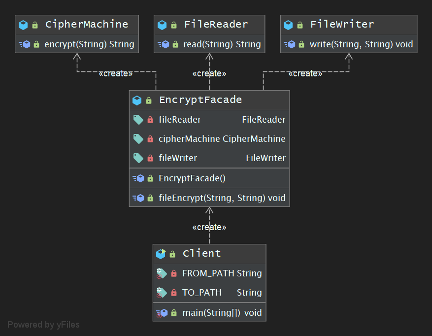 下面是一个使用外观设计模式的简单示例程序 : 写一个用于文件加密的模块,该模块的功能为对指定文件中的数据进行加密并将加密之后的数据保存到新的文件中. 具体流程包括三个部分 : 读取源文件中的数据, 数据加密, 将加密后的数据写入到新文件