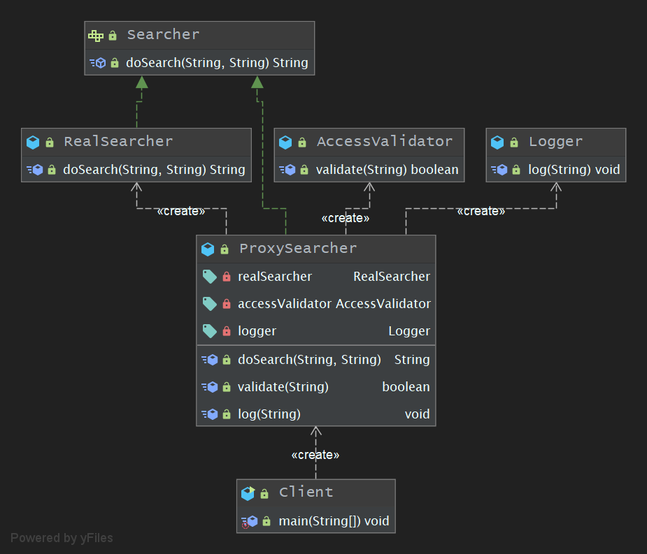 }ProxySearcher类 : 代理查询类, 充当代码主题角色, 它是查询代理, 维持了对RealSearcher, AccessValidator, 及Logger对象的引用