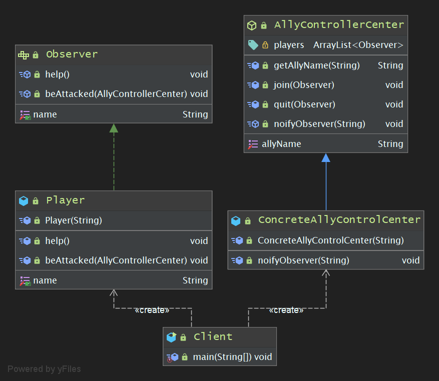 下面是一个使用观察者设计模式的简单示例程序,模拟功能 : 在某多人联机对战游戏中,多个玩家可以加入同一战队组成联盟,当战队中的某一成员被敌人攻击时,其可以向其它队友发送求救通知,队友接收通知后作出相应的反应,既而来实现战队成员之间的联动~