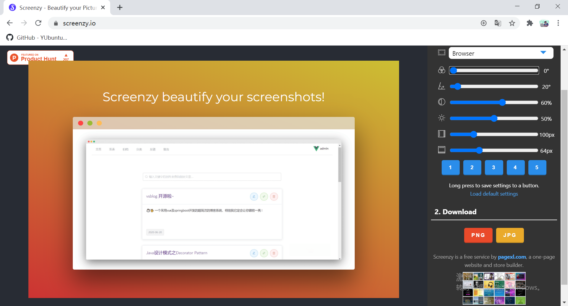 Screenzy是另一个简单的图片和截图美化工具,受Screely启发并增加了一些功能,包括:使用字体选择标题、相框、粘贴图像或URL、渐变背景、内存预设等.